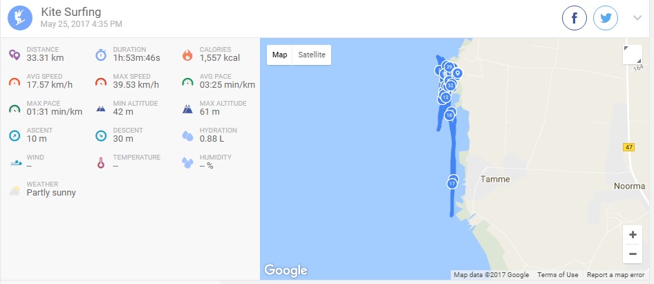 Täitsa hea oli. Päev algas küll pettumusega, sest eilse prognoosi järgi olid juba hommikul asjad autos, aga prognoos oli kadunud. Ei lootnudki enam ja olin juba jõusaalis omale aja bronninud, aga töölt koju sõites puud tuules kiikusid ja nii saigi see jõusaali bronn tühistatud ning ikkagi Tammele sõidetud. Ilmselt tabasin ka kõige paremat hetke, sest esimese otsa tuules tuli isegi maha natuke tõmmata. Suurema osa ajast üksi. Lõpus tuli Anella ka seltsi. Temal nii hästi ei läinud, sest tuul hakkas ära vajuma, aga oma mõned triibud sai ikka tehtud. Mis seal ikka - vahel nii juhtub ja soojas vees on ikka tore mulistada.